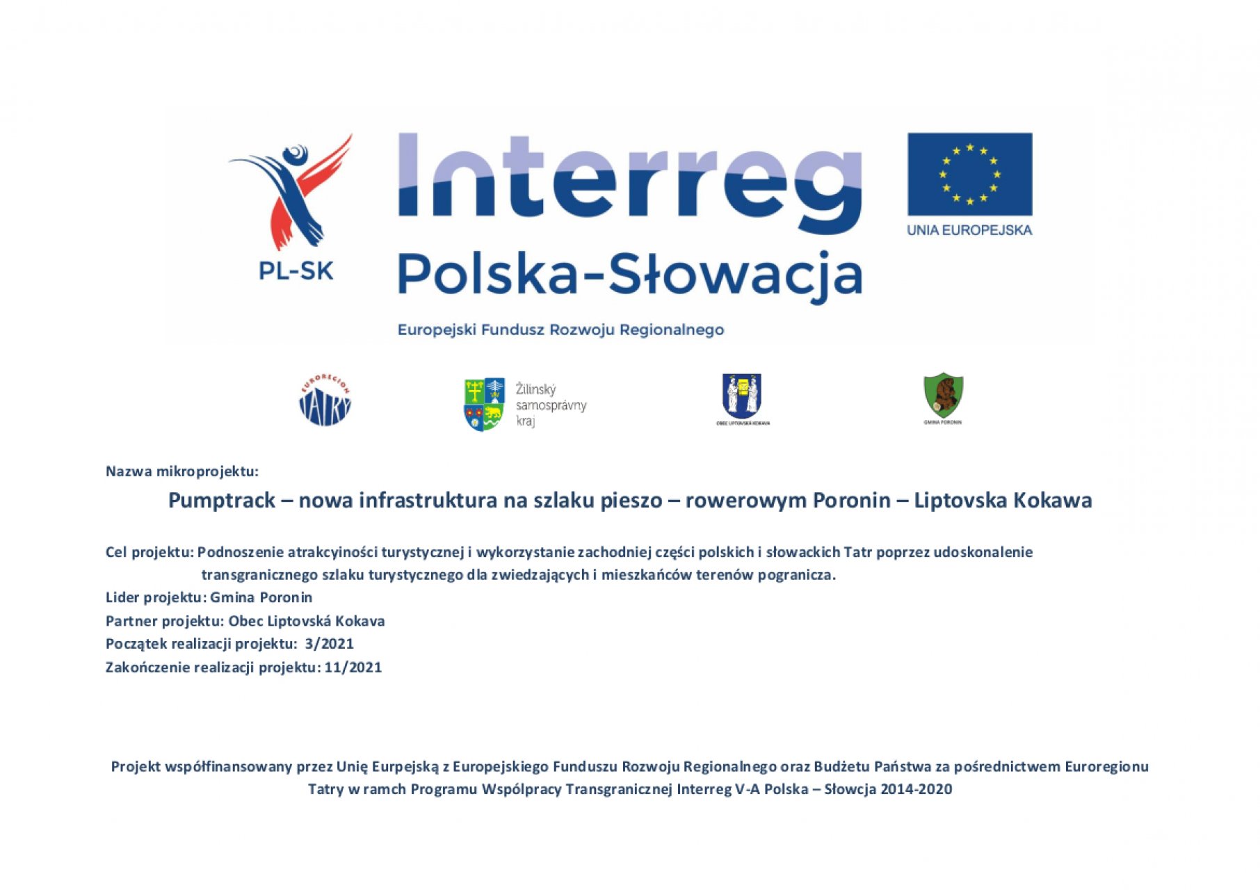 Gmina Poronin w dniu 21.01.2021 r. podpisała umowę o dofinansowanie mikroprojektu indywidualnego realizowanego z Obec Liptovska Kokava pt. „Pumptrack – nowa infrastruktura na szlaku pieszo – rowerowym Poronin – Liptovska Kokawa”. Projekt współfinansowany przez Unię Europejską z Europejskiego Funduszu Rozwoju Regionalnego oraz Budżetu Państwa za pośrednictwem Euroregionu Tatry w ramach Programu Współpracy Transgranicznej Interreg V-A Polska – Słowacja 2014-2020.